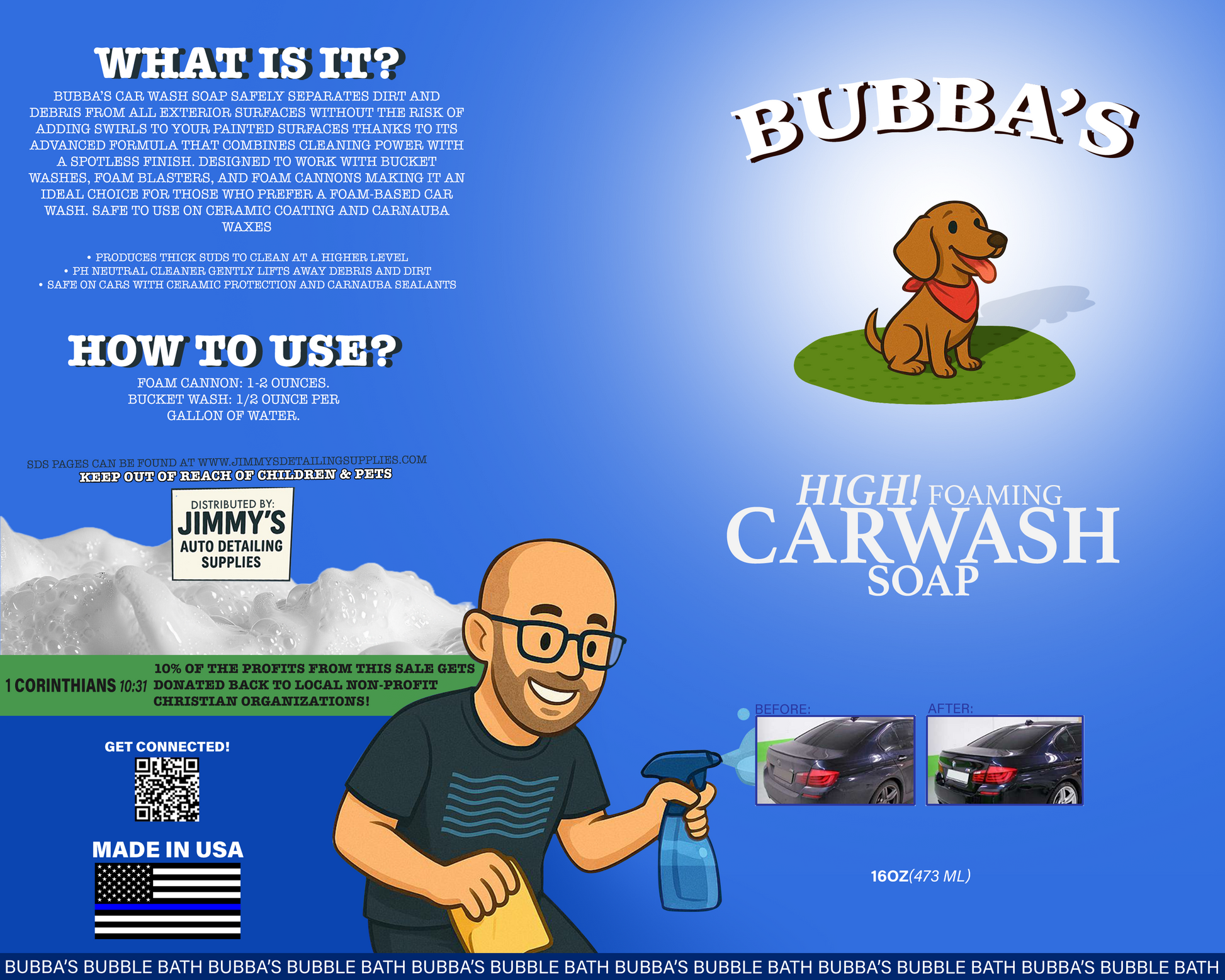 Bubba’s High Foaming Car Wash Soap safely separates dirt and debris from all exterior surfaces without the risk of adding swirls to your painted surfaces thanks to its advanced formula that combines cleaning power with a spotless finish. Designed to work with bucket washes, foam blasters, and foam cannons making it an ideal choice for those who prefer a foam-based car wash. Safe to use on ceramic coating and carnauba waxes